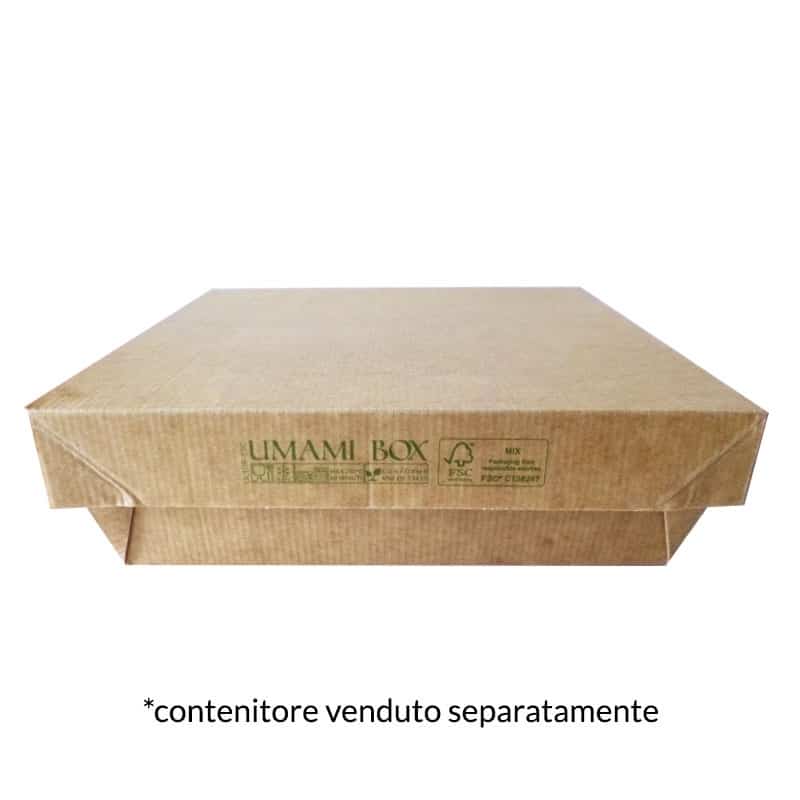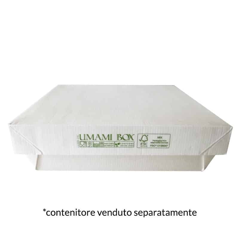 Il pratico coperchio è ideale per la conservazione dei prodotti e può andare in forno a microonde e tradizionale per riscaldare e cuocere le pietanze oppure in frigorifero per il congelamento. Il coperchio è progettato per richiudere sia la vaschetta Umami Box 09 sia la vaschetta Umami Box 15 e rendere così pratico l’asporto.